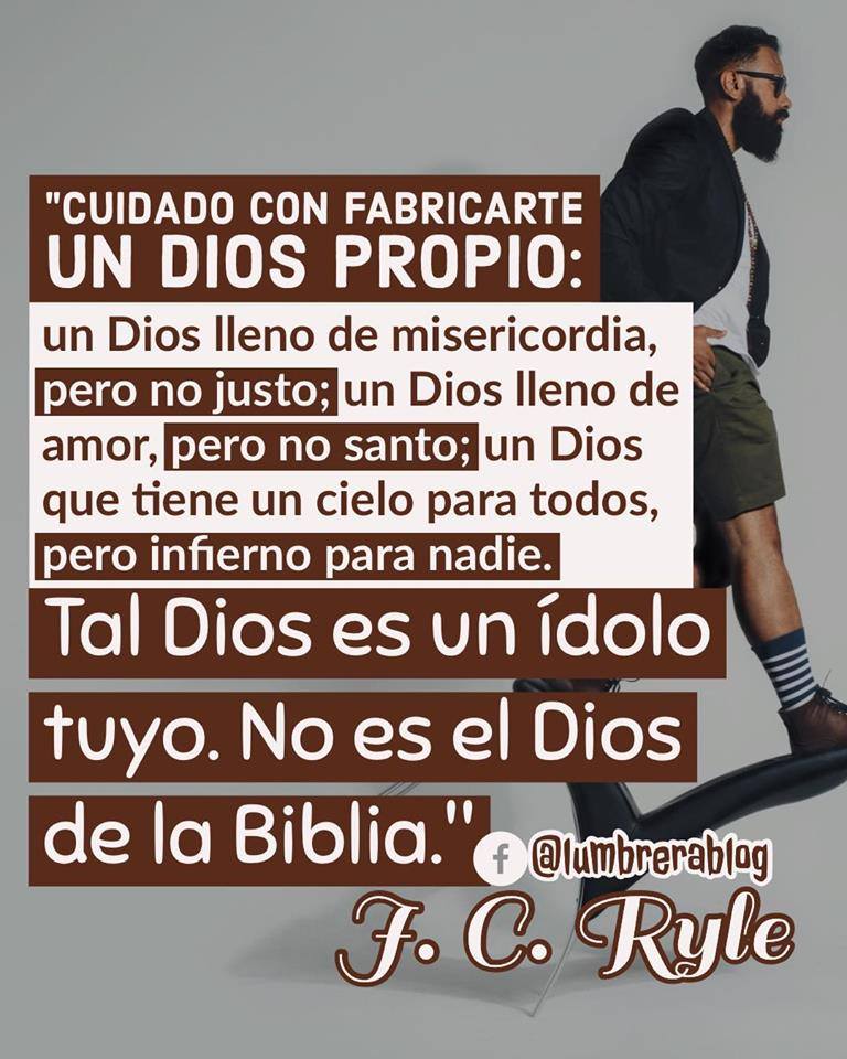 “Cuidado con fabricarte un Dios propio: un Dios lleno de misericordia, pero no justo; un Dios lleno de amor, pero no santo; un Dios que tiene un cielo para todos, pero infierno para nadie. Tal Dios es un ídolo tuyo. No es el Dios de la Biblia.” (J. C. Ryle)